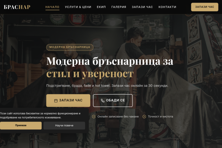 Премиум сайт за мъжка бръснарница с онлайн резервации, свободни часове в реално време и представяне на екипа.