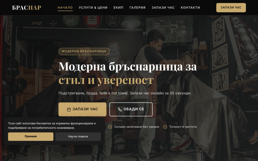 Елегантен сайт за мъжки салон за красота с онлайн резервации и галерия.